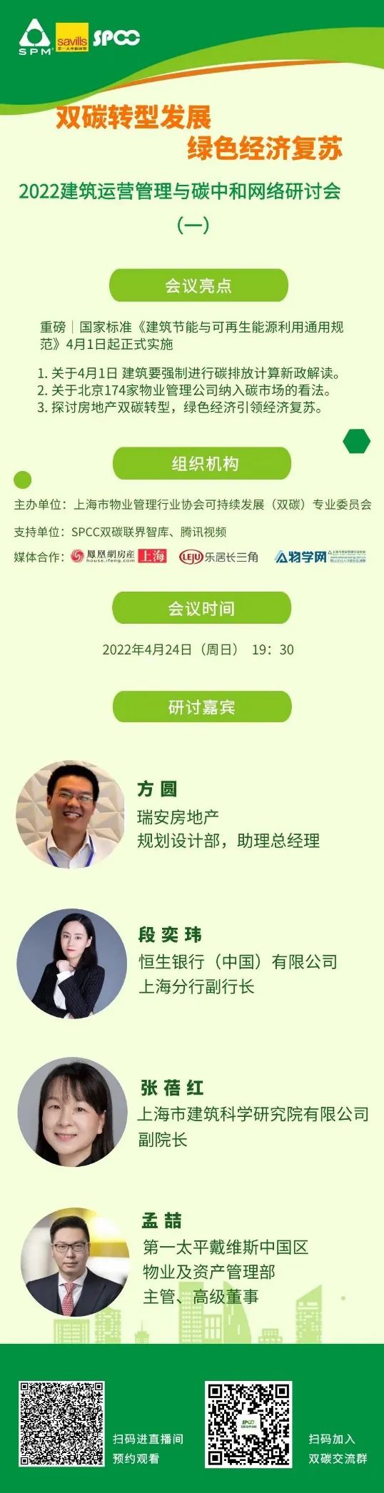 2022年4月24日(周日)晚19點30分,上海建科院、第一太平戴維斯、瑞安房地產(chǎn)、恒豐銀行圍繞“雙碳轉(zhuǎn)型發(fā)展,綠色經(jīng)濟(jì)復(fù)蘇”,為大家做精彩分享,盡情期待。
