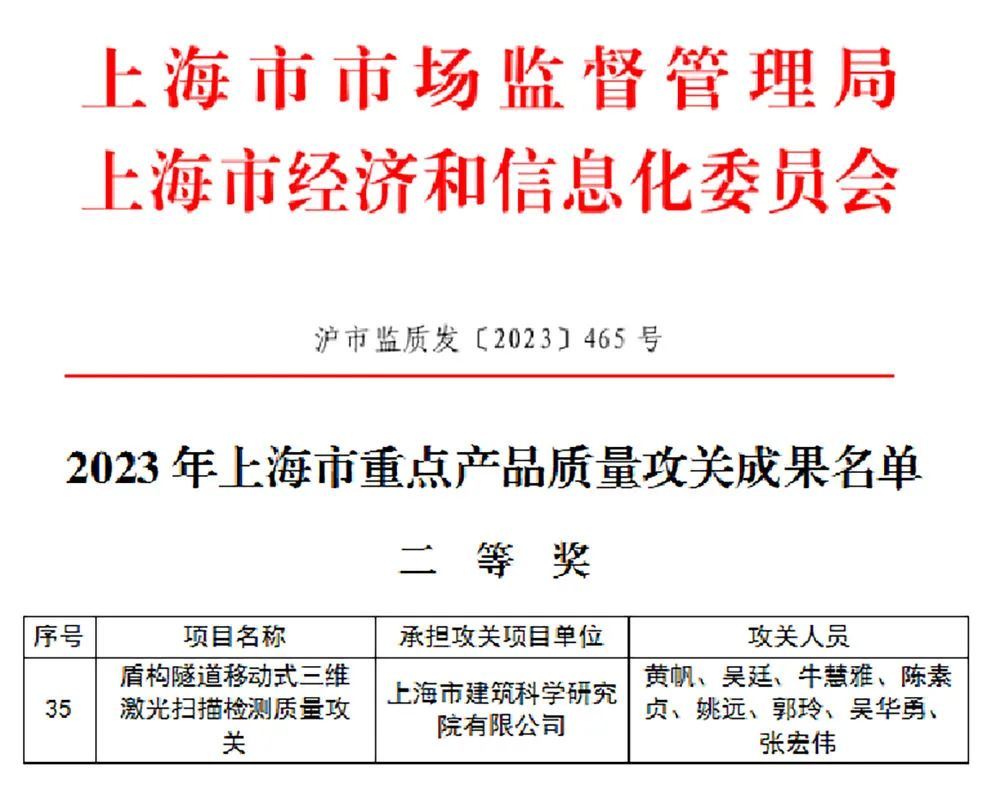 近日,上海市市場監(jiān)督管理局、上海市經(jīng)濟和信息化委員會聯(lián)合發(fā)布了《關(guān)于表揚2023年上海市重點產(chǎn)品質(zhì)量攻關(guān)成果的通知》,上海市建筑科學(xué)研究院有限公司推出的“盾構(gòu)隧道移動式三維激光掃描檢測”榮獲二等獎。