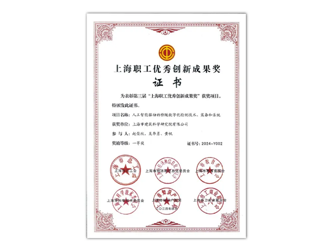 近日,上海市建筑科學研究院有限公司的技術成果“人工智能驅動的橋隧數(shù)字化檢測技術、裝備和系統(tǒng)”在第三屆“上海職工優(yōu)秀創(chuàng)新成果獎”評選活動中榮獲一等獎。
