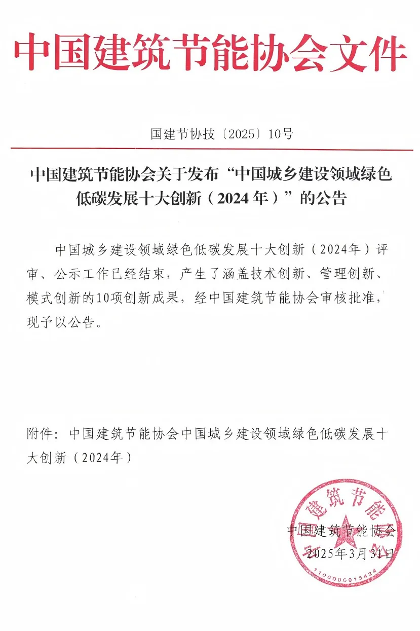 中國建筑節(jié)能協(xié)會組織開展的“中國城鄉(xiāng)建設(shè)領(lǐng)域綠色低碳發(fā)展十大創(chuàng)新(2024年)”評選活動,旨在貫徹落實黨中央國務(wù)院關(guān)于加快推動經(jīng)濟社會全面綠色轉(zhuǎn)型的決策部署,通過科技創(chuàng)新和管理創(chuàng)新引領(lǐng)城鄉(xiāng)建設(shè)領(lǐng)域綠色轉(zhuǎn)型。該活動面向高校、科研院所、行業(yè)頭部企業(yè)及院士、勘察設(shè)計大師等專家廣泛征集創(chuàng)新成果,經(jīng)嚴格評審,最終遴選出對2024年中國城鄉(xiāng)建設(shè)領(lǐng)域綠色低碳發(fā)展最具影響力和示范性的十大創(chuàng)新成果。