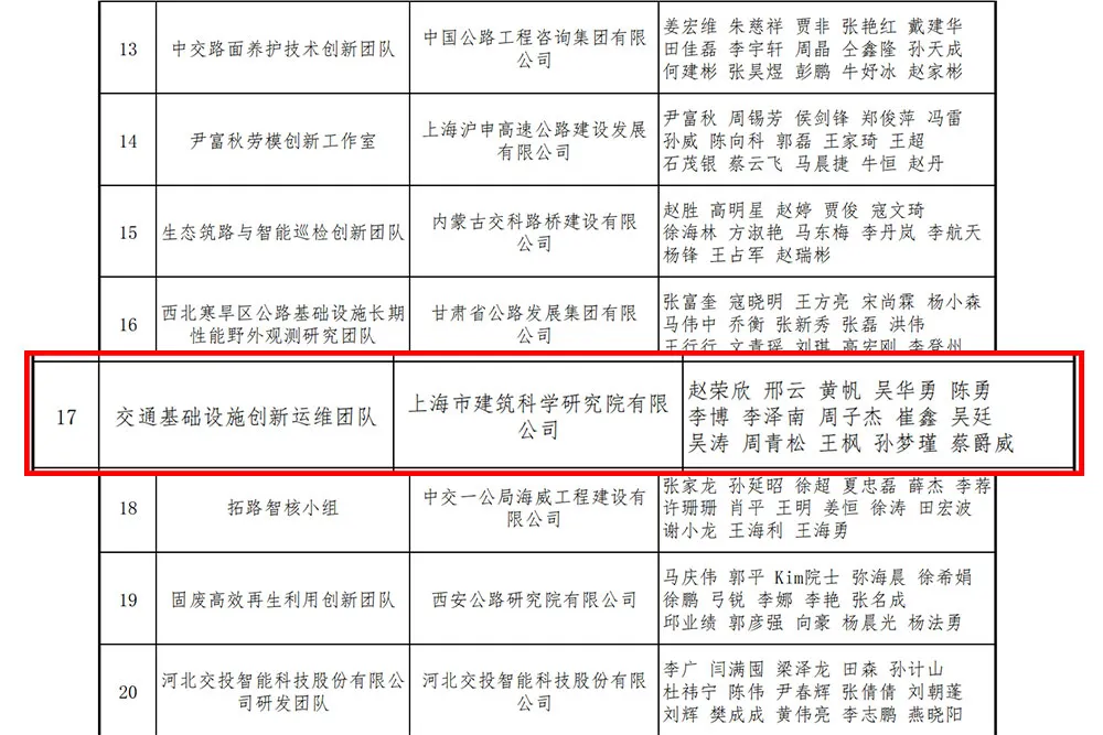 近日,首屆“茅以升路橋工程師創(chuàng)新團隊”評選結(jié)果揭曉,上海建科院黨委副書記、總經(jīng)理趙榮欣領銜的交通基礎設施創(chuàng)新運維團隊憑借在智能運維領域的開創(chuàng)性成就,從全國頂尖團隊中脫穎而出,榮膺首屆“茅以升路橋工程師創(chuàng)新團隊”稱號。
