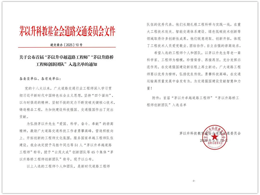 “茅以升路橋工程師創(chuàng)新團隊”由茅以升科技教育基金會道路交通委員會組織評選,旨在傳承茅以升先生“愛國、科學、奮斗、奉獻”的精神火炬,激發(fā)道路交通科技工作者勇攀科技高峰的壯志豪情,厚植“敢為人先、追求卓越”的工程師文化沃土,助力國家卓越工程師戰(zhàn)略實施。