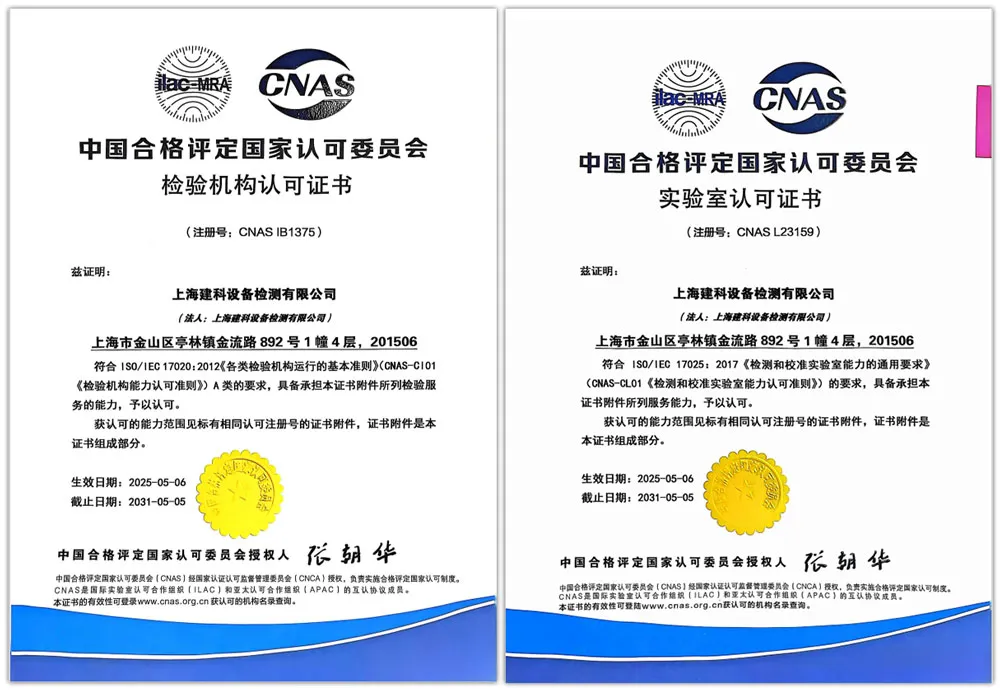 近日,上海市建筑科學研究院有限公司下屬上海建科設(shè)備檢測有限公司經(jīng)中國合格評定國家認可委員會(CNAS)批準,公司正式獲得CNAS檢驗機構(gòu)認可證書(注冊號:CNAS IB1375)及實驗室認可證書(注冊號:CNAS L23159),其技術(shù)能力與服務水平再獲國家級權(quán)威認證。